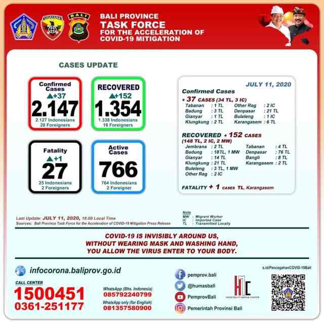 Denpasar, LenteraEsai.id- Pemerintah Provinsi Bali melalui Gugus Tugas Percepatan Penanganan Covid-19 menyampaikan perkembangan penanganan Corona Virus Disease (COVID-19) di Provinsi Bali hingga hari Sabtu, 11 Juli 2020.