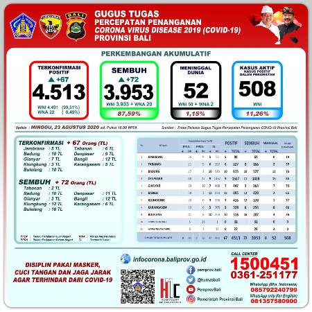 Ketua Harian Gugus Tugas Percepatan Penanganan Covid-19 Provinsi Bali Dewa Made Indra menyebutkan, secara kumulatif, kasus terkonfirmasi positif menjadi 4.513 orang, sembuh 3.953 orang (87,59%), dan meninggal dunia 52 orang (1,15%).