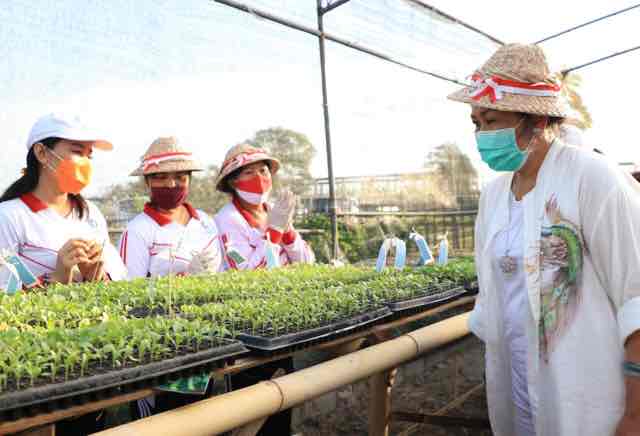 Di sela-sela kunjungannya ke TOSS Karangdadi yang dirangkai dengan panen di kebun HATINYA PKK Klungkung, Ny Putri Koster menyerahkan bantuan berupa masker dan 100 paket sembako. Ia juga menyemangati para pekerja pemilah sampah dan menyebut pekerjaan yang mereka lakukan sangat mulia.