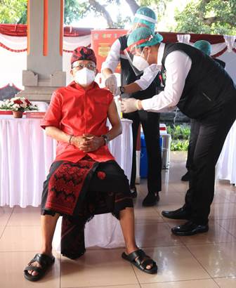Dengan menggunakan pakaian adat Bali, penyuntikan vaksin di bagian lengan kiri Gubernur Bali dilakukan oleh dr Putu Gede Surya Wibawa MBiomed SpPD yang merupakan salah satu dokter penyakit dalam di Rumah Sakit Bali Mandara (RSBM).