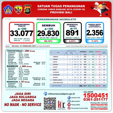 Ketua Harian Satgas Penanganan Covid-19 Provinsi Bali Dewa Made Indra di Denpasar, Selasa (23/2) mengatakan, secara kumulatif kasus terkonfirmasi positif Covid-19 di Bali kini menjadi 33.077 orang, pasien sembuh 29.830 orang (90,18%), dan yang meninggal dunia 891 orang (2,69%). Untuk kasus aktif per hari ini menjadi 2.356 orang (7,12%).