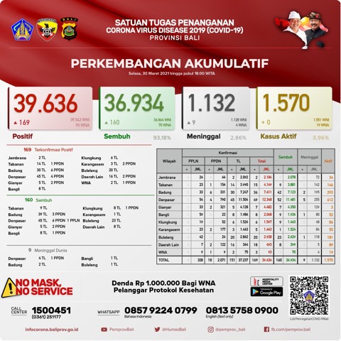 Ketua Harian Satgas Penanganan Covid-19 Provinsi Bali Dewa Made Indra di Denpasar, Selasa (30/3) mengatakan, secara kumulatif kasus terkonfirmasi positif Covid-19 di Bali kini menjadi 39.636 orang, pasien sembuh 36.934 orang (93,18%), dan yang meninggal dunia 1.132 orang (2,86%). Untuk kasus aktif per hari ini menjadi 1.570 orang (3,96%).