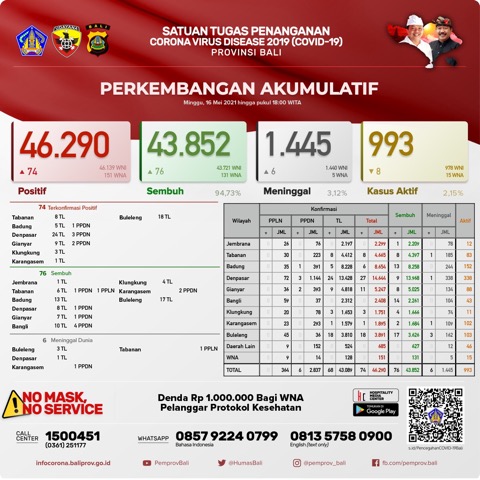 Ketua Harian Satgas Penanganan Covid-19 Provinsi Bali Dewa Made Indra di Denpasar, Minggu (16/5) sore mengatakan, secara kumulatif kasus terkonfirmasi positif Covid-19 di Bali kini menjadi 46.290 orang, pasien sembuh 43.852 orang (94,73%), dan yang meninggal dunia 1.445 orang (3,12%). Untuk kasus aktif per hari ini menjadi 993 orang (2,15%).