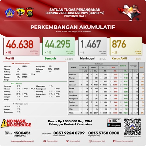 Ketua Harian Satgas Penanganan Covid-19 Provinsi Bali Dewa Made Indra di Denpasar, Kamis (20/5) sore mengatakan, secara kumulatif kasus terkonfirmasi positif Covid-19 di Bali kini menjadi 46.638 orang, pasien sembuh 44.295 orang (94,98%), dan yang meninggal dunia 1.467 orang (3,15%). Untuk kasus aktif per hari ini menjadi 876 orang (1,88%).
