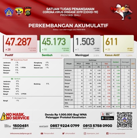 Denpasar, LenteraEsai.id – Sekretaris Daerah Dewa Made Indra yang juga selaku Ketua Harian Gugus Tugas Percepatan Penanganan Covid-19 Provinsi Bali melaporkan bahwa pertambahan kasus pada Selasa (1/6/2021) ialah terkonfirmasi sebanyak 28 orang (27 orang melalui transmisi lokal dan 1 PPDN), sembuh sebanyak 50 orang, dan 1 orang meninggal dunia.