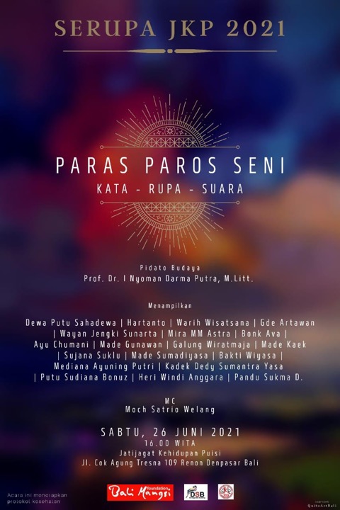 Kegiatan ini diadakan oleh Jatijagat Kehidupan Puisi (JKP) bekerja sama dengan Bali Mangsi Foundation dan Dermaga Seni Buleleng (DSB). Digelar pada hari Sabtu, 26 Juni 2021, pukul 16.00 wita – selesai di Jatijagat Kehidupan Puisi, Jalan Cok Agung Tresna No.109 Renon, Denpasar. Acara ini juga bisa diikuti melalui siaran langsung di grup FB Jatijagat Kehidupan Puisi. Bagi yang hadir dalam kegiatan ini diwajibkan tetap menjalankan prokes Covid-19.