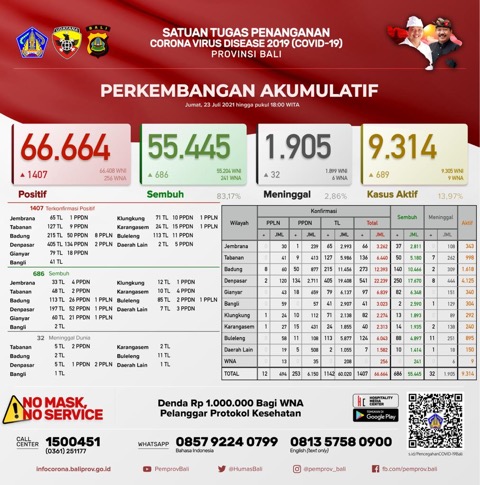 Ketua Harian Satgas Penanganan Covid-19 Provinsi Bali Dewa Made Indra di Denpasar, Jumat (23/7) sore mengatakan, secara kumulatif kasus terkonfirmasi positif Covid-19 di Bali kini menjadi 66.664 orang, pasien sembuh 55.445 orang (83,17%), dan yang meninggal dunia 1.905 orang (2,86%). Sementara kasus aktif per hari ini menjadi 9.314 orang (13,97%).
