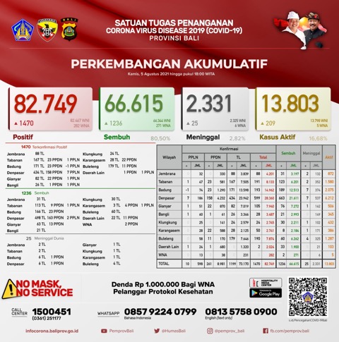 Ketua Harian Satgas Penanganan Covid-19 Provinsi Bali Dewa Made Indra di Denpasar, Kamis (5/8) sore mengatakan, secara kumulatif kasus terkonfirmasi positif Covid-19 di Bali kini menjadi 82.749 orang, pasien sembuh 66.615 orang (80,50%), dan yang meninggal dunia 2.331 orang (2,82%). Sementara kasus aktif per hari ini menjadi 13.803 orang (16,68%).