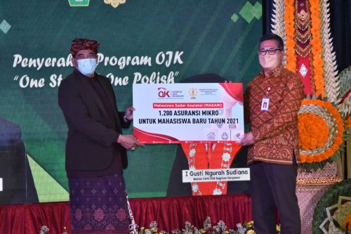 Kepala OJK Regional 8 Bali dan Nusa Tenggara Giri Tribroto secara simbolis menyerahkan polis asuransi mikro kepada kurang lebih 1.200 mahasiswa baru angkatan tahun 2021 yang diterima oleh Rektor Universitas Hindu Negeri I Gusti Bagus Sugriwa, Prof Dr Drs I Gusti Ngurah Sudiana MSi.