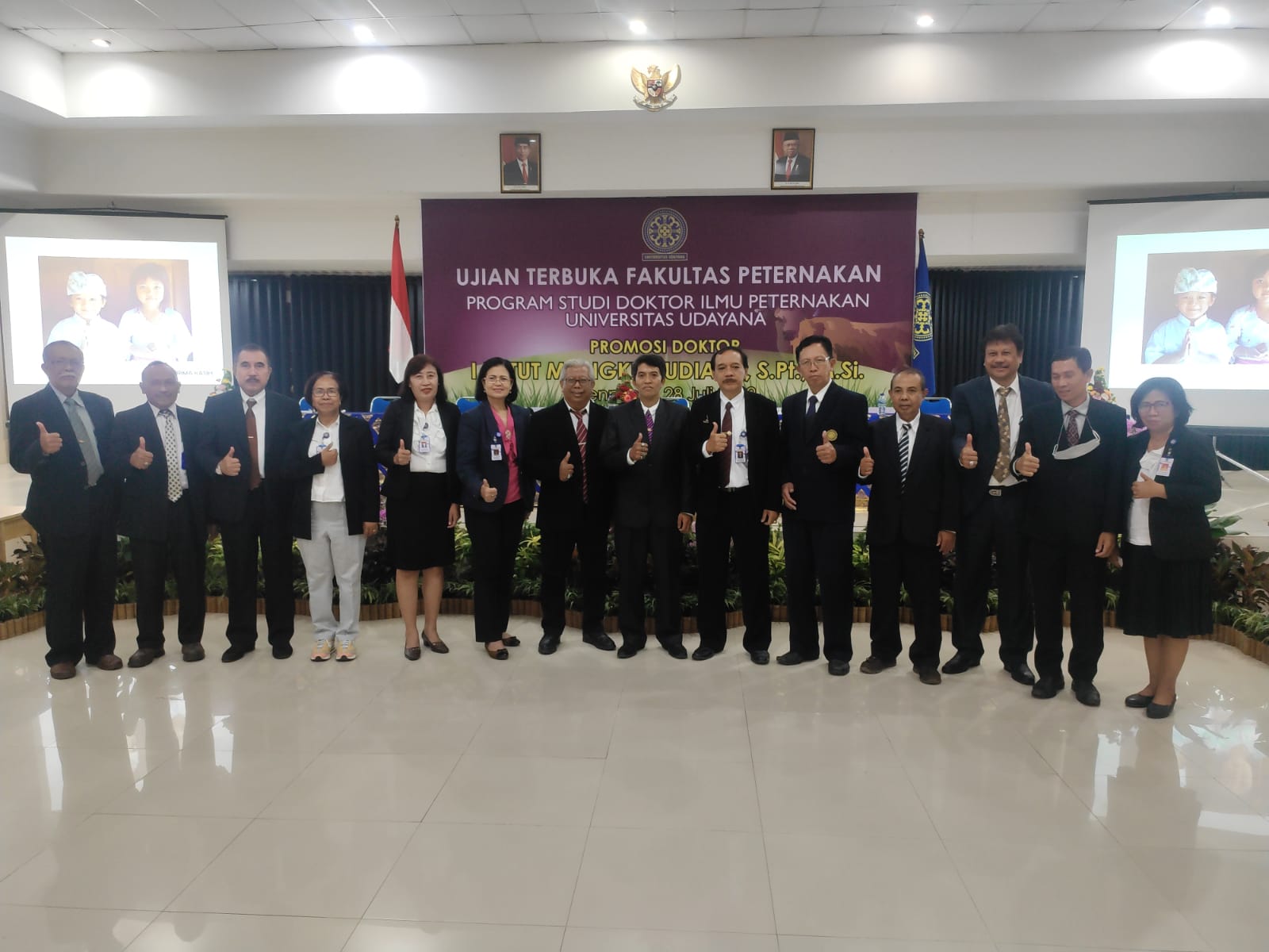 Tim Promotor terdiri atas Prof Dr Ir I Wayan Suarna MS, Prof Dr Ir I Gede Mahardika MS, dan Prof Dr Ir Ni Nyoman Suryani MSi. Promosi doktor pada hari ini menghadirkan 5 orang dosen penyanggah dan 4 dosen undangan akademik dari Fapet Unud. Disertasi yang berhasil dipertahankan promovenda berjudul ‘Keberagaman Ketersediaan Tumbuhan Pakan dan Pengaruhnya Terhadap Dinamika Penampilan Sapi Bali Pada Lahan Sub Optimal di Kabupaten Karangasem’.