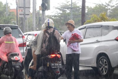 Tampak puluhan anggota Badan Kesatuan Bangsa dan Politik (Kesbangpol) Provinsi Bali dipimpin langsung oleh Kepala Badan Kesbangpol Provinsi Bali Dewa Putu Mantera yang tak mengenal lelah, walaupun diguyur hujan tetap membagikan bendera Merah Putih di Jalan By Pass Ngurah Rai, tepatnya di persimpangan jalan depan KFC Desa Sanur Denpasar Selatan, pada Rabu (10/8).
