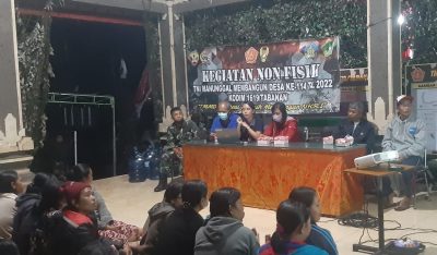 Pada Rabu (10/8) malam, dalam sasaran non fisik TMMD ke-114 kembali digelar Penyuluhan/Sosialisasi kesehatan dan gizi yang diikuti oleh masyarakat Banjar Anyar Desa Sangketan dengan pemateri dari Dinas Kesehatan Tabanan yang dikoordinir oleh Ni Wayan Sri Ari Murti AMd Gz bersama 4 orang didampingi Danramil 1619-08/Penebel Kapten Inf I Nyoman Arya Kepakisan dan anggota staf Teritorial Kodim 1619/Tabanan.