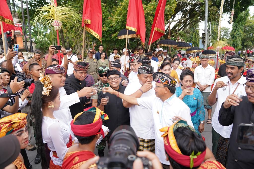 Selanjutnya rombongan sempat melakukan tosh arak sebelum memasuki lokasi acara yang dihadiri Forkopimda, Penglingsir Puri se-Kabupaten Gianyar, perbekel, bendesa adat, hingga kepala sekolah se-Kabupaten Gianyar.