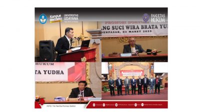Promovendus berhasil mempertahankan disertasinya yang berjudul ‘ Formulasi Kewenangan PPATK dalam Penyidikan TPPU yang Belum Diketahui Tindak Pidana Asalnya’, pada sidang promosi doktor yang diselenggarakan oleh PDIH FH Unud di aula Kampus Denpasar, Jumat (3/3/2023).