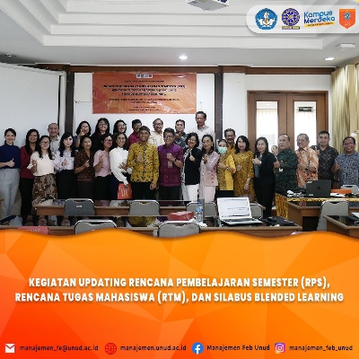 Badung, LenteraEsai.id – Program Studi Sarjana Manajemen Fakultas Ekonomi dan Bisnis Universitas Udayana (FEB Unud) melaksanakan kegiatan updating Rencana Pembelajaran Semester (RPS) dan Rencana Tugas Mahasiswa (RTM) serta Silabus Blended Learning pada Jumat, 31 Maret 2023, bertempat di Gedung MM Lantai 3 FEB Unud Bukit Jimbaran, Badung.