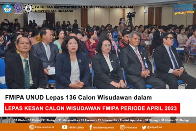 Denpasar, LenteraEsai.id – Pada hari Rabu (12/4/2023) Fakultas Matematika dan Ilmu Pengetahuan Alam Universitas Udayana menggelar acara pelepasan calon wisudawan/wati periode April 2023, bertempat di Aula Nusantara, Gedung Agrokompleks Universitas Udayana Denpasar dan dihadiri oleh Dekan FMIPA Dra. Ni Luh Watiniasih, M.Sc, Ph.D, para Wakil Dekan, Ketua Senat, Koordinator Program Studi, para Koordinator Unit, calon wisudawan/wati, dan orang tua calon wisudawan/wati.