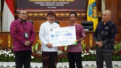 Wagub Bali yang turut didampingi oleh Deputi Direktur BPJS Ketenagakerjaan wilayah Bali, Nusa Tenggara dan Papua, Kuncoro Budi Winarno dan Kepala Dinas Ketenagakerjaan dan Energi Sumber Daya Mineral Provinsi Bali Ida Bagus Setiawan, menyerahkan piagam dan hadiah kepada para pemenang. Dalam kesempatan tersebut Wagub Bali juga menyerahkan secara simbolis santunan BPJS Ketenagakerjaan kepada ahli waris. (LE-DP1)