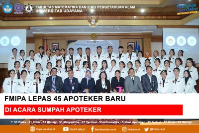 Denpasar, LenteraEsai.id – Fakultas Matematika dan Ilmu Pengetahuan Alam Universitas Udayana (FMIPA Unud) pada Kamis (4/5) menggelar acara Sumpah Apoteker Angkatan XXV Periode Mei 2023. Acara ini diadakan atas keja sama antara Universitas Udayana dengan Konsil Kefarmasian.
