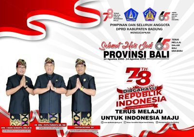Mangupura, LenteraEsai.id – Pimpinan dan segenap anggota DPRD Kabupaten Badung mengucapkan selamat Hari Jadi ke-65 Provinsi Bali 14 Agustus 2023 ‘Terus Melaju Dalam Bali Era Baru’. Dan Dirgahayu ke-78 Republik Indonesia 17 Agustus 2023 ‘Terus Melaju untuk Indonesia Maju’.