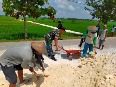 “Ini sudah tugas dan kewajiban saya sebagai Babinsa untuk bisa berkontribusi di lingkungan masyarakat,” ujar Tri Laksono, penuh semangat sambil mendorong ‘gerobak’ beroda tunggal yang dipakai alat untuk mengangkut material urugan.