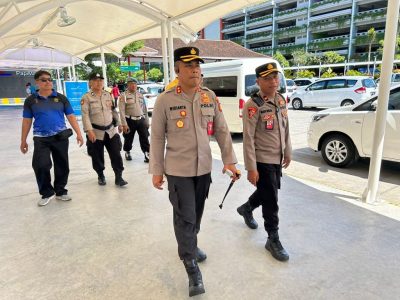 Kapolres AKBP I Ketut Widiarta melakukan pengecekan dengan berjalan kaki menyusuri sepanjang areal pickup zone domestik kemudian koridor terminal kedatangan domestik, Lounge Domestik Angkasa Pura hingga terminal domestik depan Posko terpadu Lebaran.