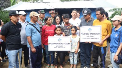Selanjutnya, di Banjar Kuum, Desa Sukawana, ‘Pemprov Bali Hadir’ menyerahkan bantuan perbaikan rumah kepada keluarga Kadek Ginawan. Kadek Ginawan beserta istri dan dua anaknya menempati rumah tidak layak huni berbahan anyaman bambu beratapkan asbes yang telah berlubang di beberapa bagian. Selain itu, diberikan pula bantuan biaya pendidikan kepada kedua anak Kadek Ginawan serta bantuan sembako.