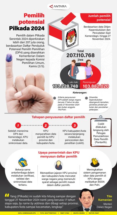 Infografis Pilkada Serentak 2024 lenteraesai8 Mei 2024647 views Infografis Pilkada Serentak 2024. ANTARA Pemilih dalam Pilkada Serentak 2024 diperkirakan lebih dari 207 juta orang, berdasarkan Daftar Penduduk Potensial Pemilih Pemilihan (DP4) yang diserahkan Kementerian Dalam Negeri (Kemendagri) kepada Komisi Pemilihan Umum (KPU), Kamis (2/5). ANTARA Pos terkaitTujuh Anggota Dewan Komisioner OJK Resmi Dilantik, Perkuat Stabilitas KeuanganViral Video Pasien Diikat, RS Soeharto Heerdjan Bantah Tuduhan SuapWapres Ke-6 RI Try Sutrisno Wafat di RSPAD pada Senin PagiVideo Heboh Anggota Paspampres di London, Istana Angkat BicaraMengkhawatirkan, Kasus HIV di Sorong Naik 48 PersenPolsek Panakukang Dalami Teror Kiriman Kepala Kambing