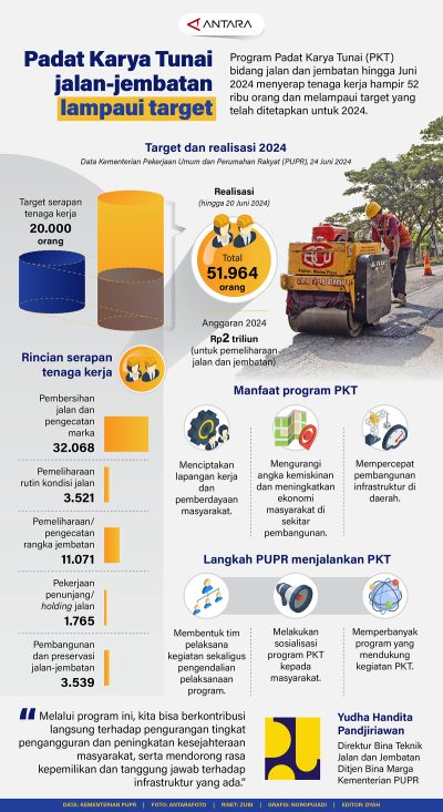 Infografis Padat Karya Tunai Jalan dan Jembatan Lampaui Target lentera36 Juli 20241,084 views Program Padat Karya Tunai (PKT) bidang jalan dan jembatan hingga Juni 2024 menyerap tenaga kerja hampir 52 ribu orang dan melampaui target yang telah ditetapkan untuk 2024. Pos terkaitTujuh Anggota Dewan Komisioner OJK Resmi Dilantik, Perkuat Stabilitas KeuanganViral Video Pasien Diikat, RS Soeharto Heerdjan Bantah Tuduhan SuapWapres Ke-6 RI Try Sutrisno Wafat di RSPAD pada Senin PagiVideo Heboh Anggota Paspampres di London, Istana Angkat BicaraMengkhawatirkan, Kasus HIV di Sorong Naik 48 PersenPolsek Panakukang Dalami Teror Kiriman Kepala Kambing