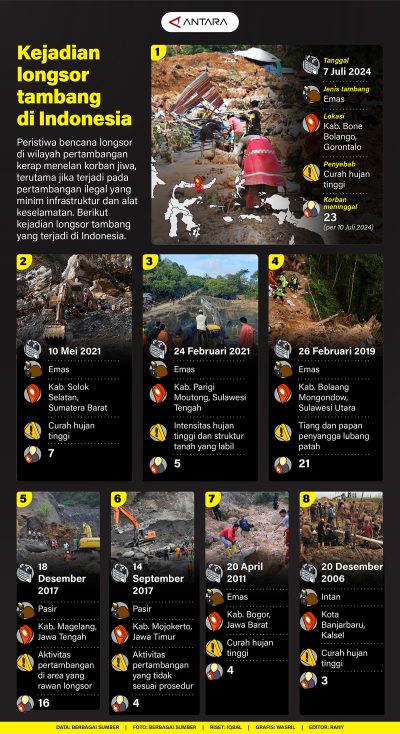 Infografis Kejadian Longsor Tambang di Indonesia lentera313 Juli 20241,065 views Peristiwa bencana longsor di wilayah pertambangan kerap menelan korban jiwa,terutama jika terjadi pada pertambangan ilegal yang minim infrastruktur dan alat keselamatan. Berikut kejadian longsor tambang yang terjadi di Indonesia. Pos terkaitTujuh Anggota Dewan Komisioner OJK Resmi Dilantik, Perkuat Stabilitas KeuanganViral Video Pasien Diikat, RS Soeharto Heerdjan Bantah Tuduhan SuapWapres Ke-6 RI Try Sutrisno Wafat di RSPAD pada Senin PagiVideo Heboh Anggota Paspampres di London, Istana Angkat BicaraMengkhawatirkan, Kasus HIV di Sorong Naik 48 PersenPolsek Panakukang Dalami Teror Kiriman Kepala Kambing