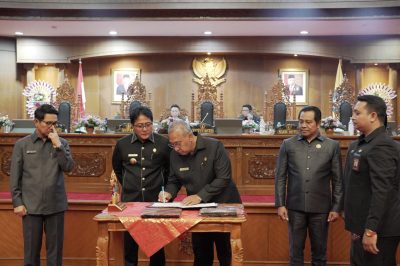 Selanjutnya, Ketua DPRD Badung Putu Parwata meminta persetujuan anggota yang hadir. “Apakah ranperda yang diajukan pemeritah dapat disetujui? “Setujuuuu,” jawab anggota serempak. Terus diketok palu. Diteruskan penandatanganan nota persetujuan, dimulai dari pimpinan DPRD Badung kemudian Bupati Badung. Rapat paripurna DPRD Badung juga diisi sambutan Bupati Badung Nyoman Giri Prasta.