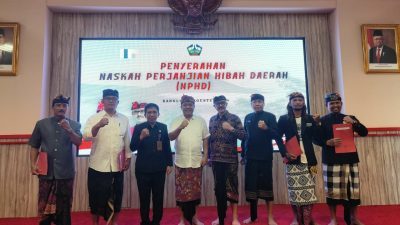 Bangli, LenteraEsai.id – Bupati Bangli SN Sedana Arta didampingi Wakil Bupati Bangli I Wayan Diar menghadiri sekaligus menyerahkan Naskah Perjanjian Hibah Daerah (NPHD) kepada Pengurus Lembaga Adat di Kab Bangli yang bertempat di Gedung Bhukti Mukti Bakti Kantor Bupati Bangli, Jumat (16/8/2024). Acara penyerahan NPHD tersebut dihadiri oleh Wakil Bupati Bangli, PLH Sekda Bangli, Pimpinan Perangkat Daerah Kab. Bangli, Para Bendesa Adat, Kelian Adat, Kelian Dadia dan Kelian Pengempon Pura penerima hibah.
