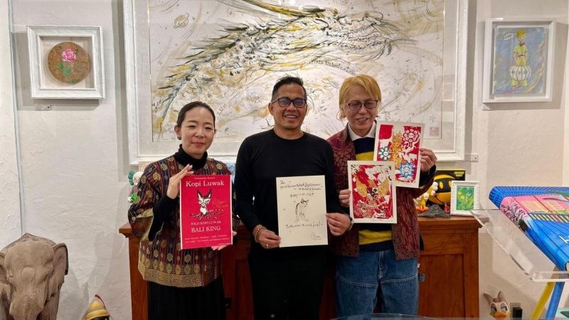 Sejumlah karya seni yang menggambarkan pertukaran budaya Indonesia-Jepang itu menampilkan guratan tangan terbaru Inoue bertema Burung Garuda, patung khas Bali, Bunga Raflesia, hingga Kopi Luwak.