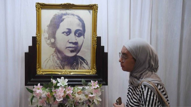 Pengunjung melintasi foto RA Kartini yang ditampilkan di Museum RA Kartini, Rembang, Jawa Tengah, Senin (21/4/2025). Museum yang menyimpan benda-benda bersejarah, buku-buku serta pemikiran dari pahlawan wanita Indonesia itu menampilkan sejarah, pengaruh dan gerakan RA Kartini dalam memperjuangkan emansipasi wanita di Indonesia. ANTARA FOTO/Akbar Nugroho Gumay/nym.