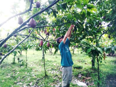 Setiba di ujung perkebunan, sejumlah pekerja terlihat sedang melakukan beraktivitas merunduk-runduk di antara tanaman kakao yang sedang berbuah lebat. Salah satunya bernama Nyoman Arjana yang tengah merabas beberapa daun kakao agar tidak terlalu rapat dan saling menutupi satu sama lain.
