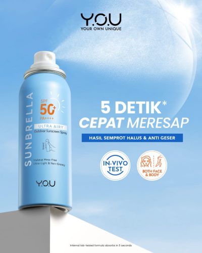 Jakarta, LenteraEsai.id – Menjawab kebutuhan perlindungan kulit dari paparan sinar matahari, Y.O.U resmi meluncurkan Sunbrella Ultra Airy Outdoor Sunscreen Spray SPF 50+ PA++++. Produk terbaru ini hadir dalam bentuk semprotan ringan yang praktis digunakan, memberikan perlindungan maksimal sekaligus perawatan kulit secara menyeluruh.