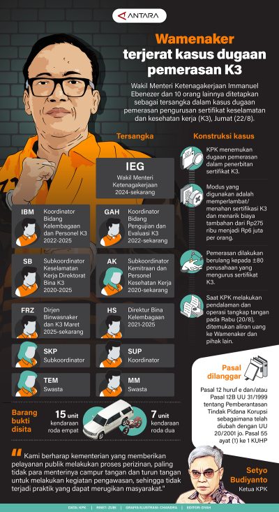 Wamenaker Terjerat Kasus Dugaan Pemerasan K3 lentera323 Agustus 202539,409 views Wakil Menteri Ketenagakerjaan (Wamenaker) Immanuel Ebenezer dan 10 orang lainnya ditetapkan sebagai tersangka dalam kasus dugaan pemerasan pengurusan sertifikat keselamatan dan kesehatan kerja (K3), Jumat (22/8). (ANT/LE) Pos terkaitPolsek Panakukang Dalami Teror Kiriman Kepala KambingBarang Ilegal dan 244 Ekor Ayam Filipina Disita TNI AL-Bea CukaiSerabi Kalibeluk Batang yang Bertahan Sejak Zaman Mataram IslamLanskap dan Peluang Kerja Gen Z “In This Economy”Catatan Kasus Korupsi 2025Tahun 2026, Dunia Tidak Menuju Keteraturan Baru